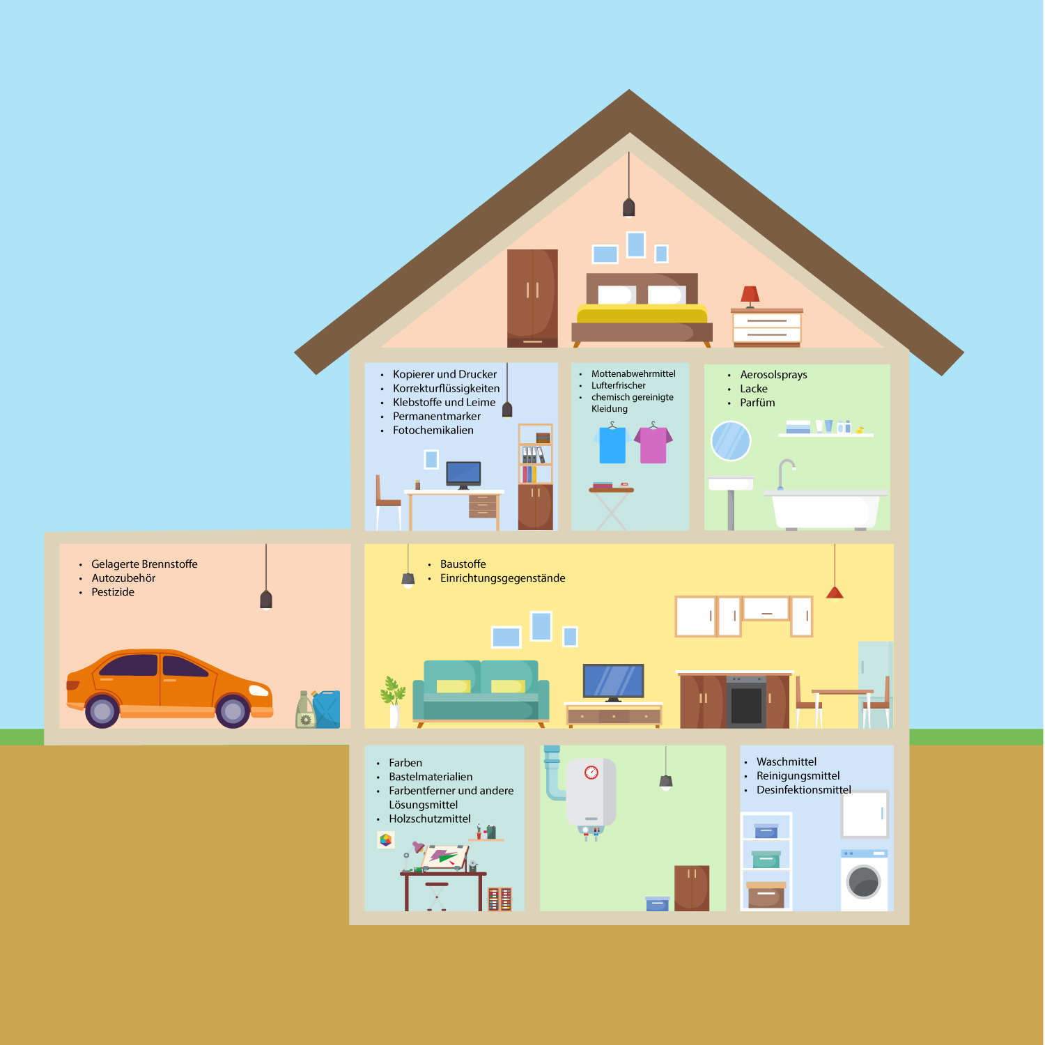 - Formaldehyd: Kommt in Möbeln, Teppichen und Klebstoffen vor.